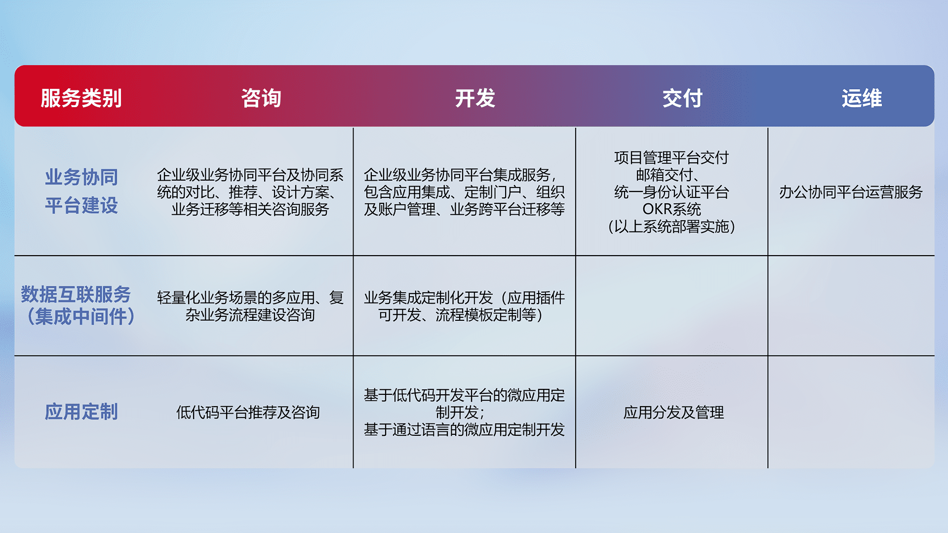 针对钉钉、、、企微、、、、IDaas等平台级产品提供产品的规划、、、、方案、、交付、、、定制化开发等服务,,实现如统一协同办公、、智能客户服务、、混合会议管理、、、智能数据查询、、、等业务场景,,,,实现数字化转型。。